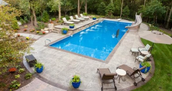 - Concrete (gunite), fiberglass, or vinyl pool installation